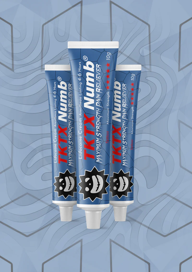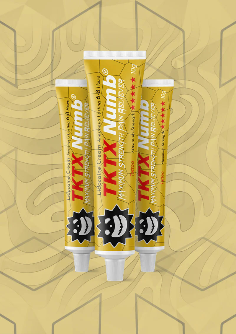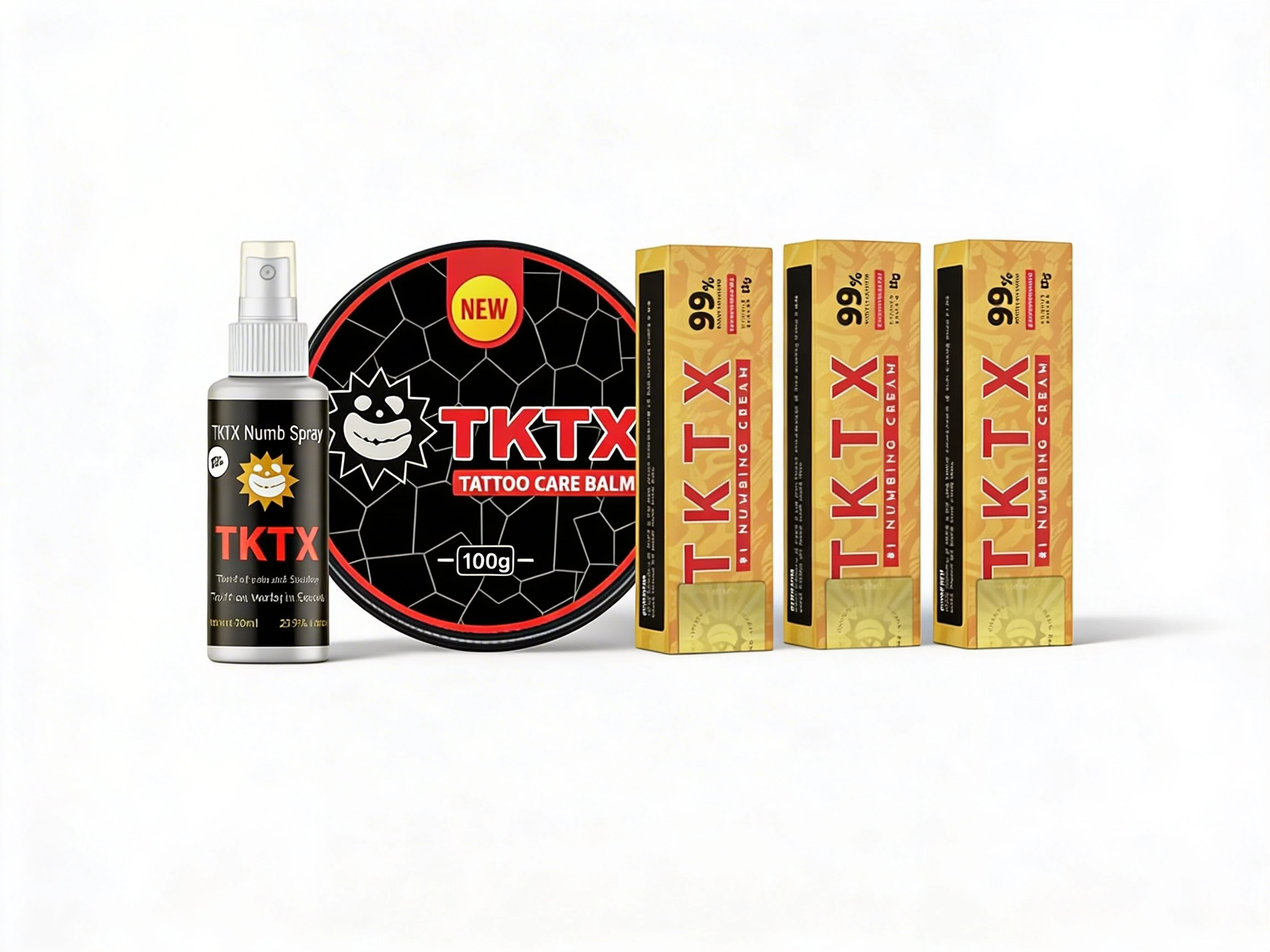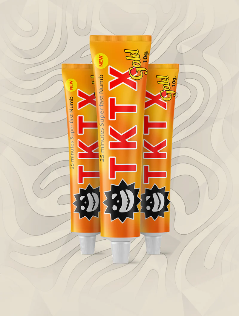 Este set incluye todo lo necesario para una sesión de tatuaje 100% libre de dolor: 3x Cremas TKTX Gold 99%, 1x Spray Anestésico TKTX y 1x Bálsamo Aftercare TKTX.